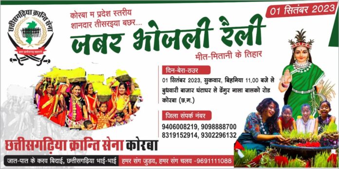 कोरबा।भोजली महोत्सव को लेकर तैयारी शुरू हो चुकी है। छत्तीसगढ़िया क्रांति सेना ने प्रदेश स्तर बैठक आयोजित कर निर्णय लिया है कि छत्तीसगढ़ की पारंपरिक वेशभूषा में बेटियां भोजली उठाएंगी। साथ ही छत्तीसगढ़ की संस्कृति को आगे बढ़ाने के लिए हर वर्ष छत्तीसगढ़िया क्रांति सेना के पदाधिकारी और उनके सेनानी बहुत ही हर्षोल्लास के साथ इस पर्व को मनाते हैं इस वर्ष भी कोरबा जिले में यह आयोजन रखा गया है जिसमें छत्तीसगढ़िया क्रांति सेना ने जिले वासियों और प्रदेश वासियों को इस पर्व पर आमंत्रित किया है जिसमें जिला और प्रदेश से हजारों की संख्या में कोरबा घंटाघर में सम्मिलित होंगे।