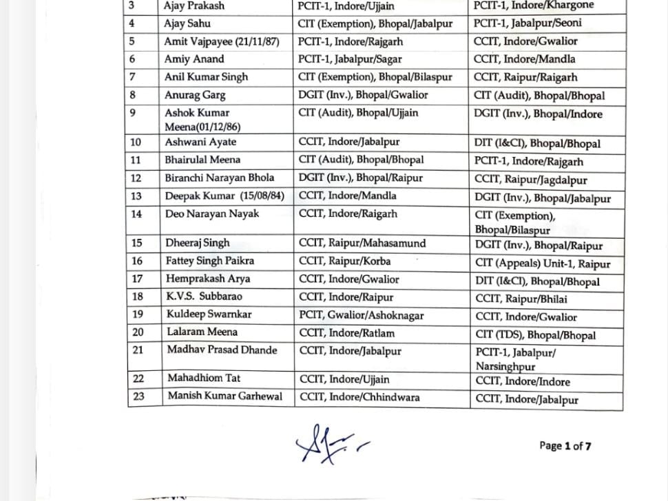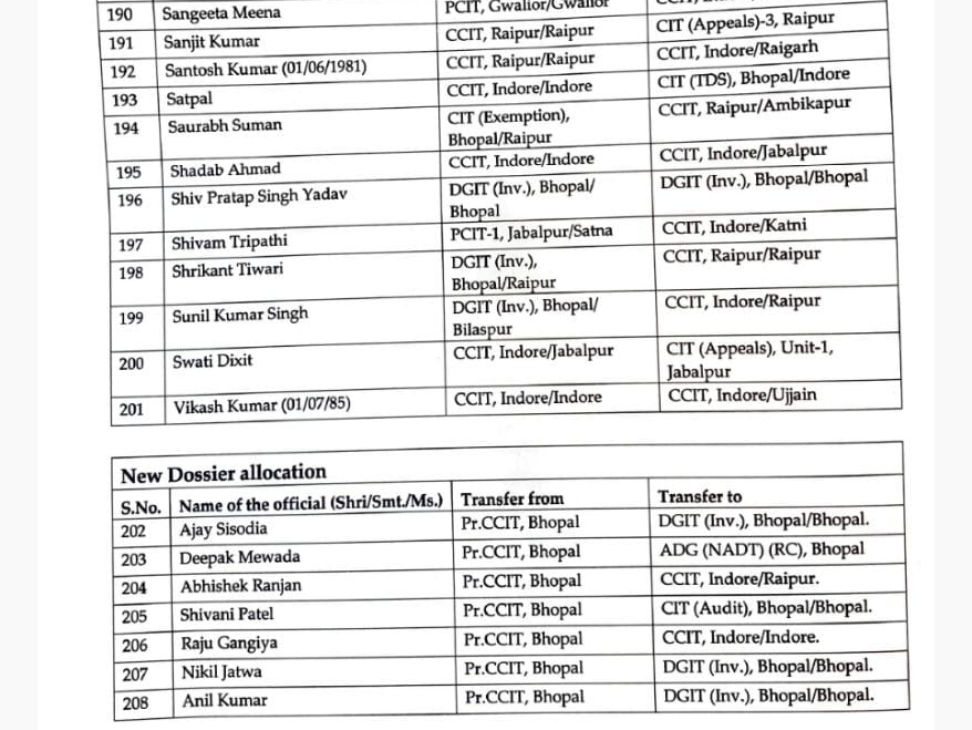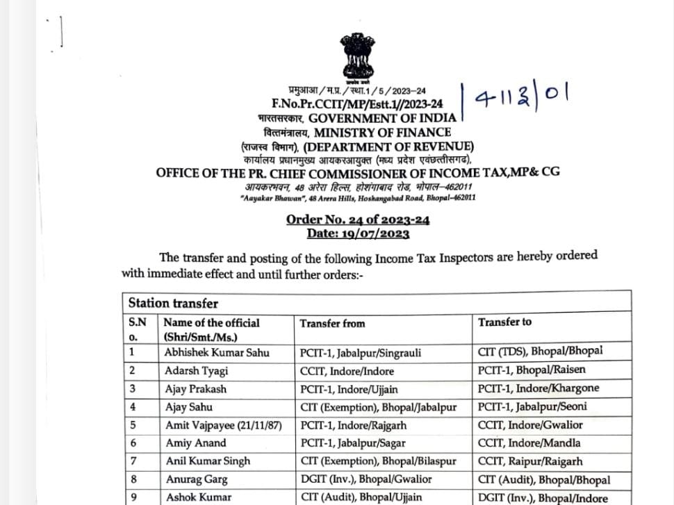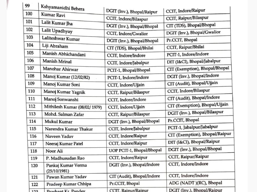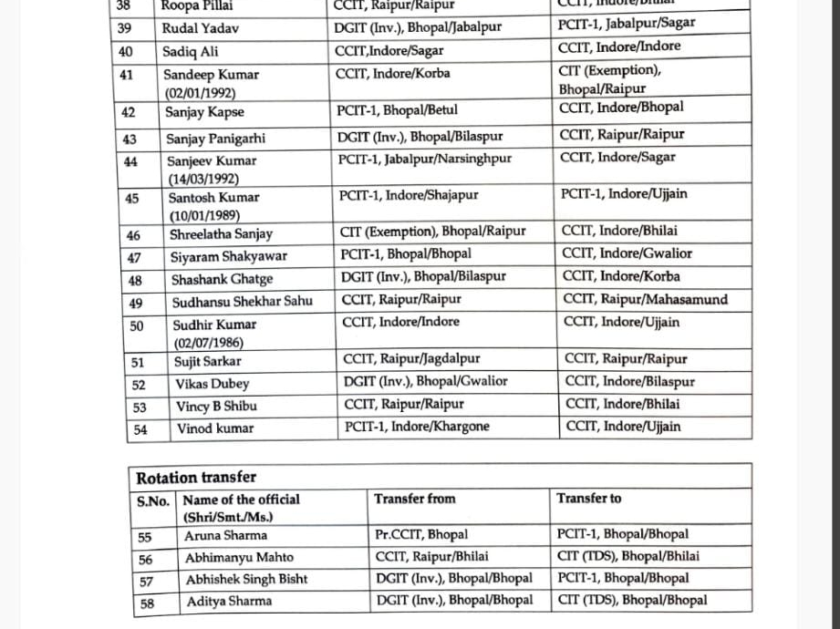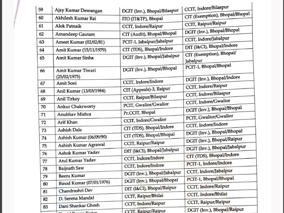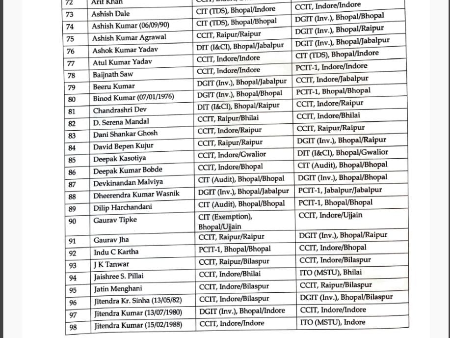 सोमवार को पूरे देश समेत छत्तीसगढ़ में भी इनकम टैक्स डे मनाया गया। इस मौके पर मध्यप्रदेश और छत्तीसगढ़ के चीफ कमिश्नर ऑफिस से 208 इनकम टैक्स इंस्पेक्टरों को नए जगहों पर पदस्थापना दी गई है। जिसमें से कई अफसरों का प्रमोशन भी किया गया है। अफसरों में 58 छत्तीसगढ़ के हैं, जिनके नाम इस लिस्ट में शामिल है।